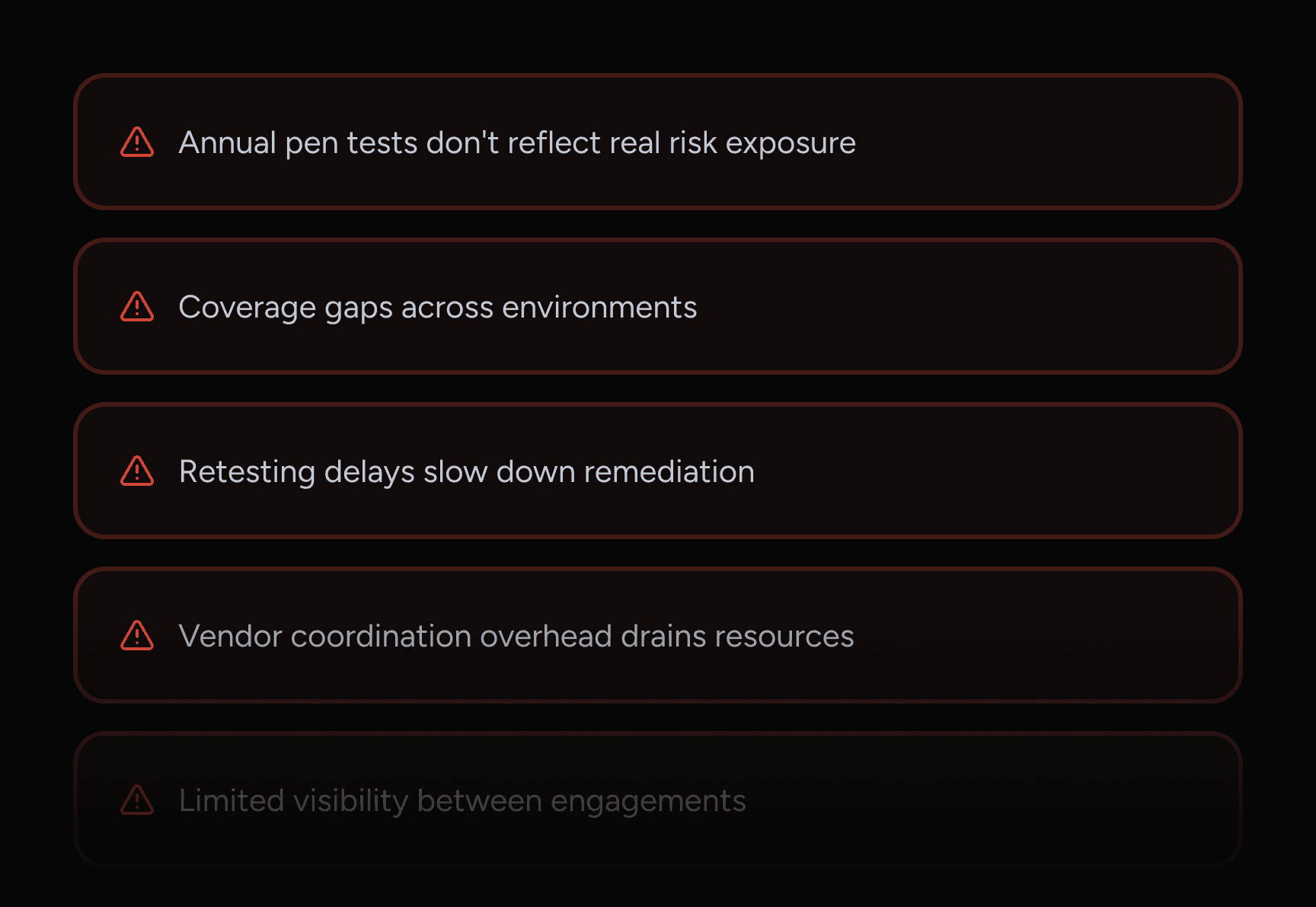 Run 4, 10, or 20+ pentests a year across all environments. Close the gap between engagements.